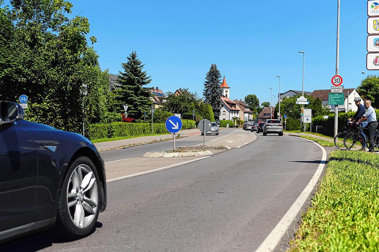 Es gibt dafür zwei Optionen: Noch im Ortsinnern von Fischbach an einer kleinen Verkehrsinsel. Hier endet offiziell einseitig der Radweg, die Straßenquerung ist also für Radfahrer gedacht. Dennoch ist sie mit ihren 2,50 Meter so kurz, dass ein Rad mit Anhänger oder etwa ein Lastenrad über sie hinausragen würde.