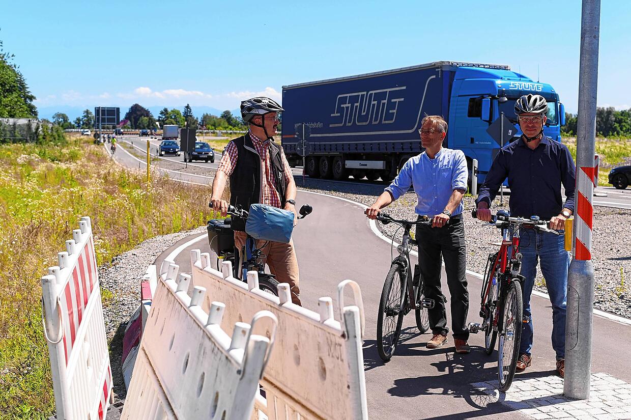 Es ist laut. Laster, Autos und Wohnwagen ziehen dicht an dicht vorbei. Der neue Fischbacher Knoten ist selbst am Dienstagmittag rege befahren. Mittendrin: Radfahrer, die dem Bodenseeradweg folgen wollen und mal diagonal und mal geradeaus an der noch abgeschalteten Ampelanlage am noch nicht freigegebenen Streckenabschnitt der neuen B 31 die Straße queren.