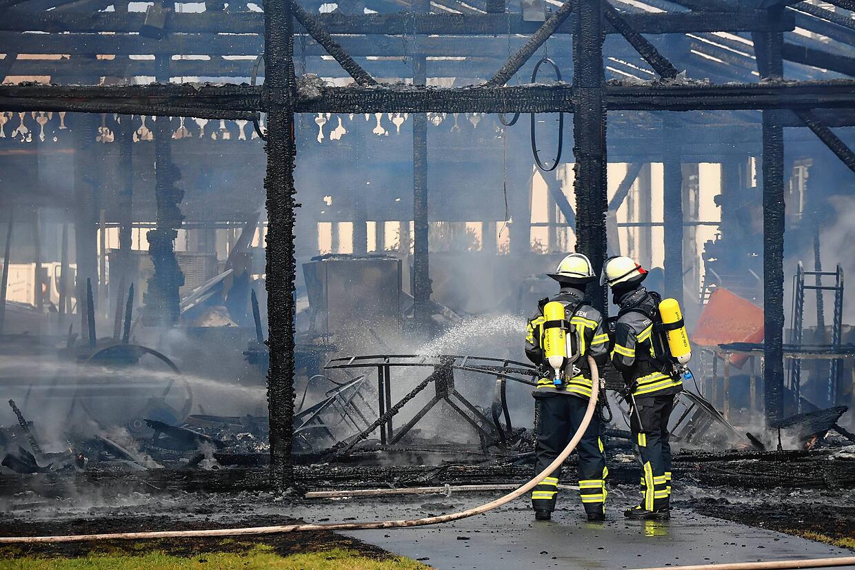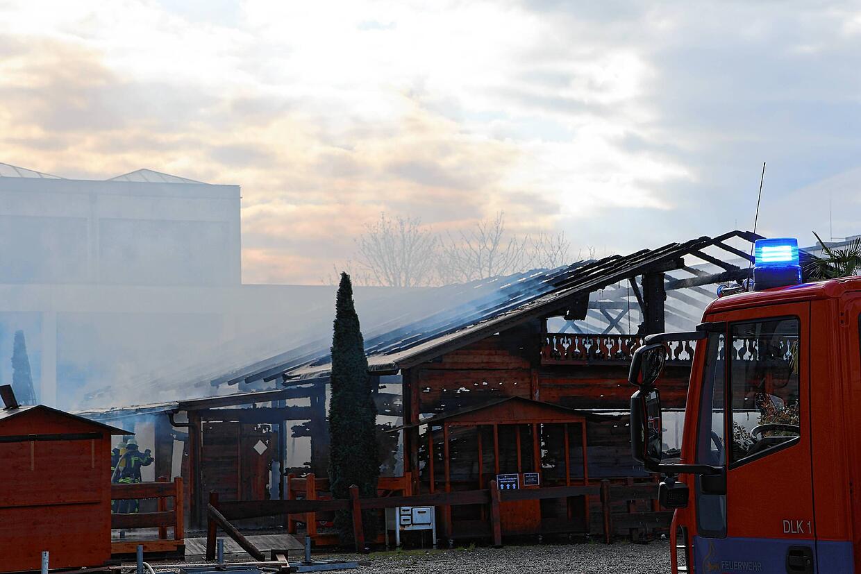 Eine Bewirtungshütte ist in Brand geraten. Mehr als 50 Einsatzkräfte der Feuerwehr sind ausgerückt. Eindrücke vom Großeinsatz am Montagabend.