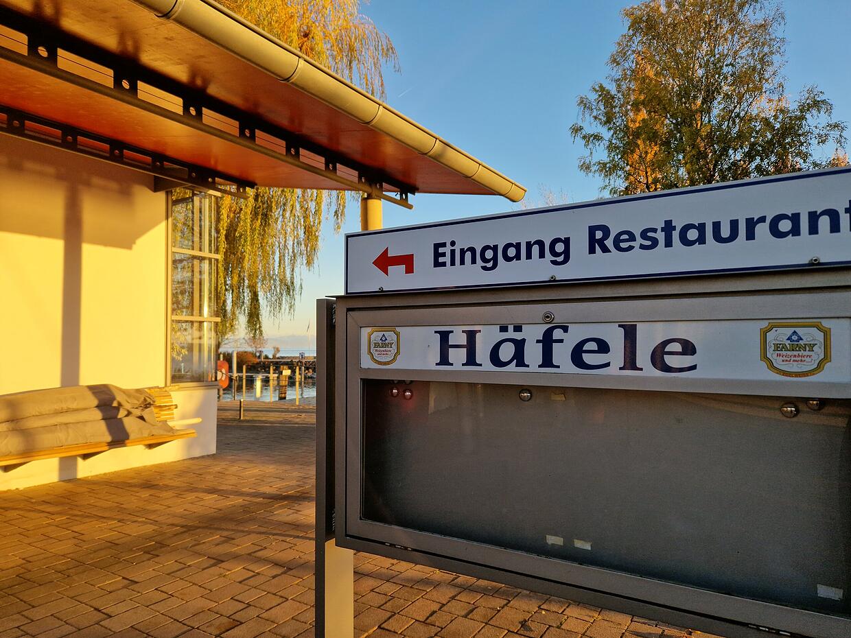 Ein herrlicher Novembernachmittag, der See glitzert, die Bäume sind bunt gefärbt. Auf der Immenstaader Lände sind viele Spaziergänger unterwegs. Einheimische, denn die Saison ist längst vorbei. Immer wieder bleiben Menschen stehen, schauen verwundert zum vom Herbstlicht angestrahlten Restaurant „Am Häfele“. Normalerweise geht das beliebte Yachtclub-Lokal erst im Dezember in den Winterschlaf, aber jetzt ist alles bereits geschlossen.
