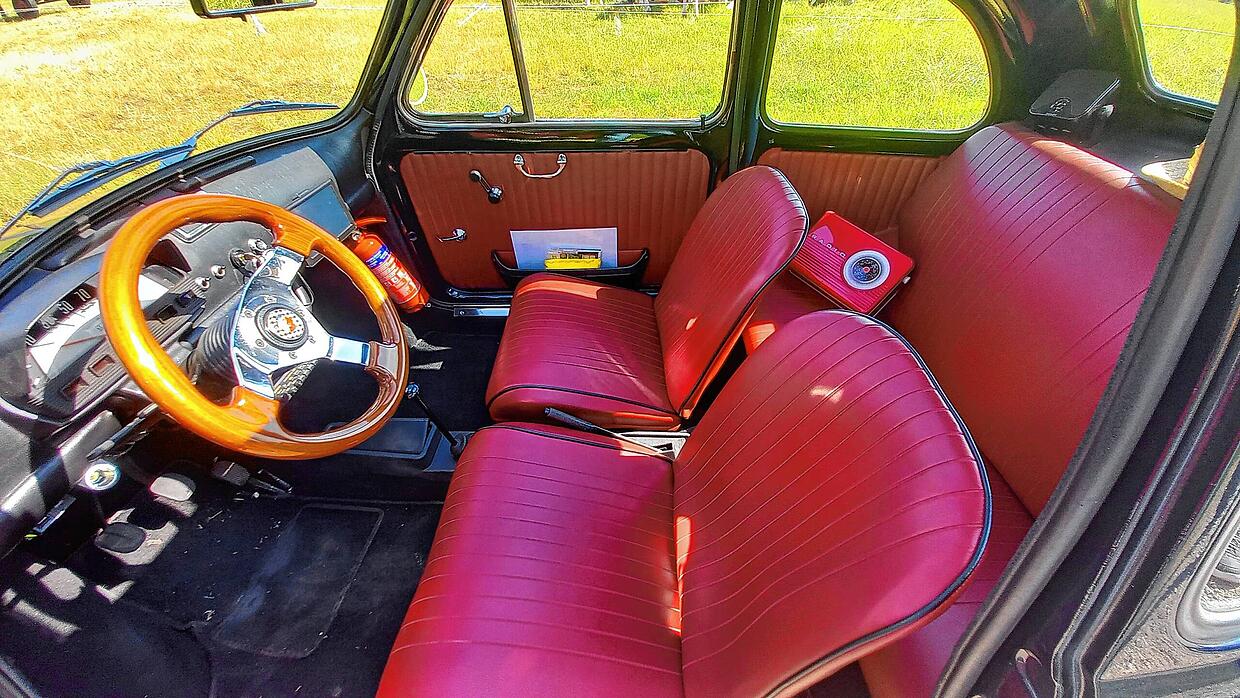 Achim Schirmann hat ein neues Fahrwerk eingebaut und das Auto 30 Millimeter tiefer gelegt, damit es optisch besser zu den Alufelgen passt. Auch die Farbe hat sich verändert, der Fiat 500 L war mal rot, jetzt ist die Lackierung dunkelblau. Dafür wurde aus der schwarzen Innenausstattung eine in bordeauxrot – „alles mit einem minimal finanziellen Aufwand verbunden“. Das Holzlenkrad wurde ebenfalls eingebaut und das Auto hat einen speziellen Alquati Auspuff. Vorn wurde auf Scheibenbremsen umgerüstet, Sicherheitsgurte gibt es keine. Eine Anschnallpflicht gab es in den 1960er-Jahren noch nicht.
