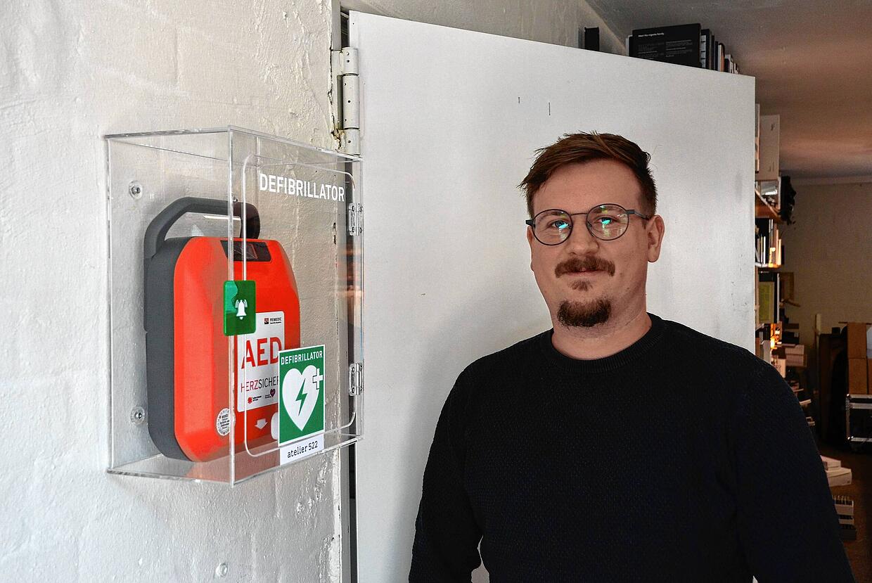 Von außen ist er kaum zu erkennen. Da bedarf es schon des ganz genauen Hinschauens, um hinter dem Schaufensterglas des „ateliers 522“ das AED-Gerät zu entdecken. Er hängt dort an einer Wand des „Material-Labors“. So heißt der Raum, in dem die Hölzer, Metalle, Steine archiviert werden. Kurz: alles, worauf die Architekten, Designer, Inneneinrichter, Grafiker und Ladenbauer des Unternehmens bei ihrer Arbeit zurückgreifen.