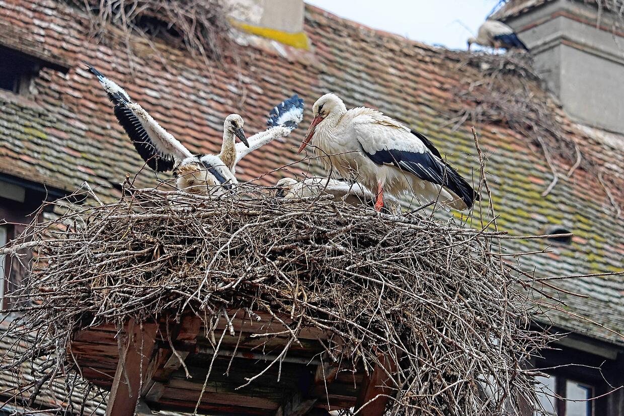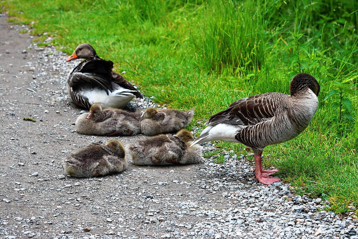 Nicht nur bei den Berberaffen ist der Nachwuchs da. Dieses Jahr gibt es jede Menge Graugans-Großfamilien, die im buchstäblichen Gänsemarsch rund um den Mendlishauser Weiher auf dem Affenberg-Gelände unterwegs sind. Auch bei den Störchen stehen die Küken bereits in den Horsten und starten ihre ersten Flatter- und Klapperversuche.