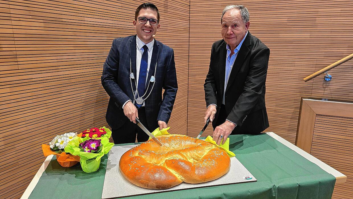 Der Bürgermeister zollte außerdem allen Vereinen, Feuerwehr, DRK, DLRG, den Unternehmen, den Kirchen und den ehrenamtlich Tätigen im Ort Lob und Anerkennung. „Danke auch an alle, die in den verschiedenen Arbeitsgruppen und Arbeitskreisen mitgewirkt und sich hier engagiert haben. Auch das ist ein Beispiel, wie Beteiligung und damit auch Demokratie geht“, sagte der Rathauschef unter dem Applaus des Publikums. Schließlich schnitt er mit Ehrenbürger Hans-Joachim Jaeger die Neujahrsbrezel an und läutete den gemütlichen Teil des Vormittags ein.