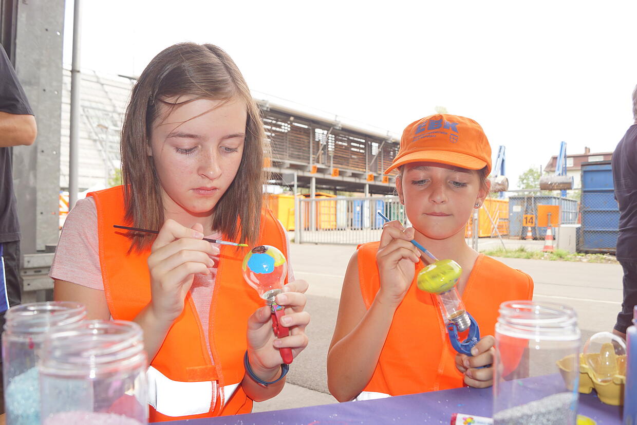 Die Kinder erfreuten sich an Warnwesten und Käppis, durften orangefarbene EBK-Taschen selbst bemalen und Glühbirnen mit Farbe zu Blühbirnen umgestalten. Auch beim Kinderschminken herrschte wie üblich starker Andrang. Bei der Konstanzer Puppenbühne gab es mit zwei Aufführungen weitere Unterhaltung.
