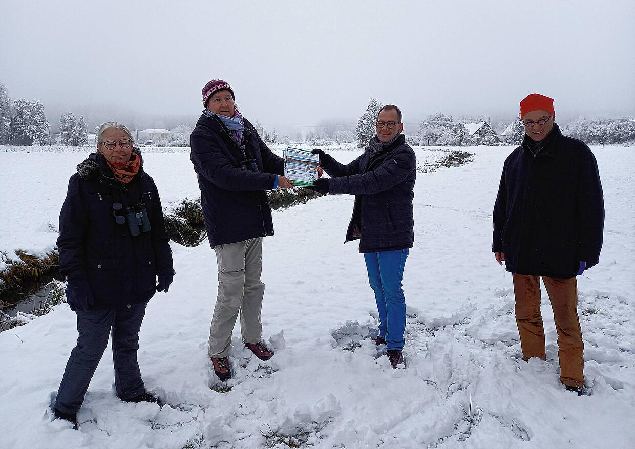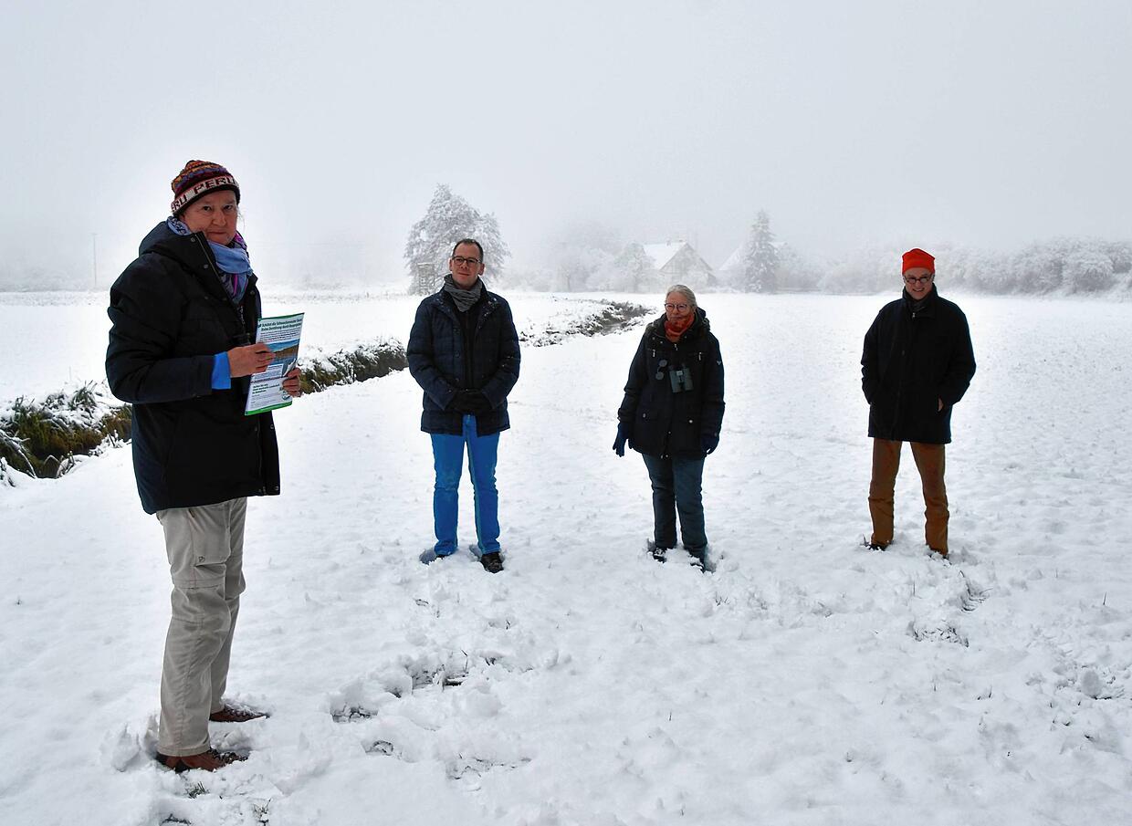 von links: Dagmar Hirt (Naturschutzinitiative Hegau/Baar), der Mühlinger Bürgermeister Thorsten Scigliano, Gisela Lejeune-Härtel (Nabu Radolfzell-Hegau) und Hans Steisslinger (BUND Stockach) | Bild: Löffler, Ramona