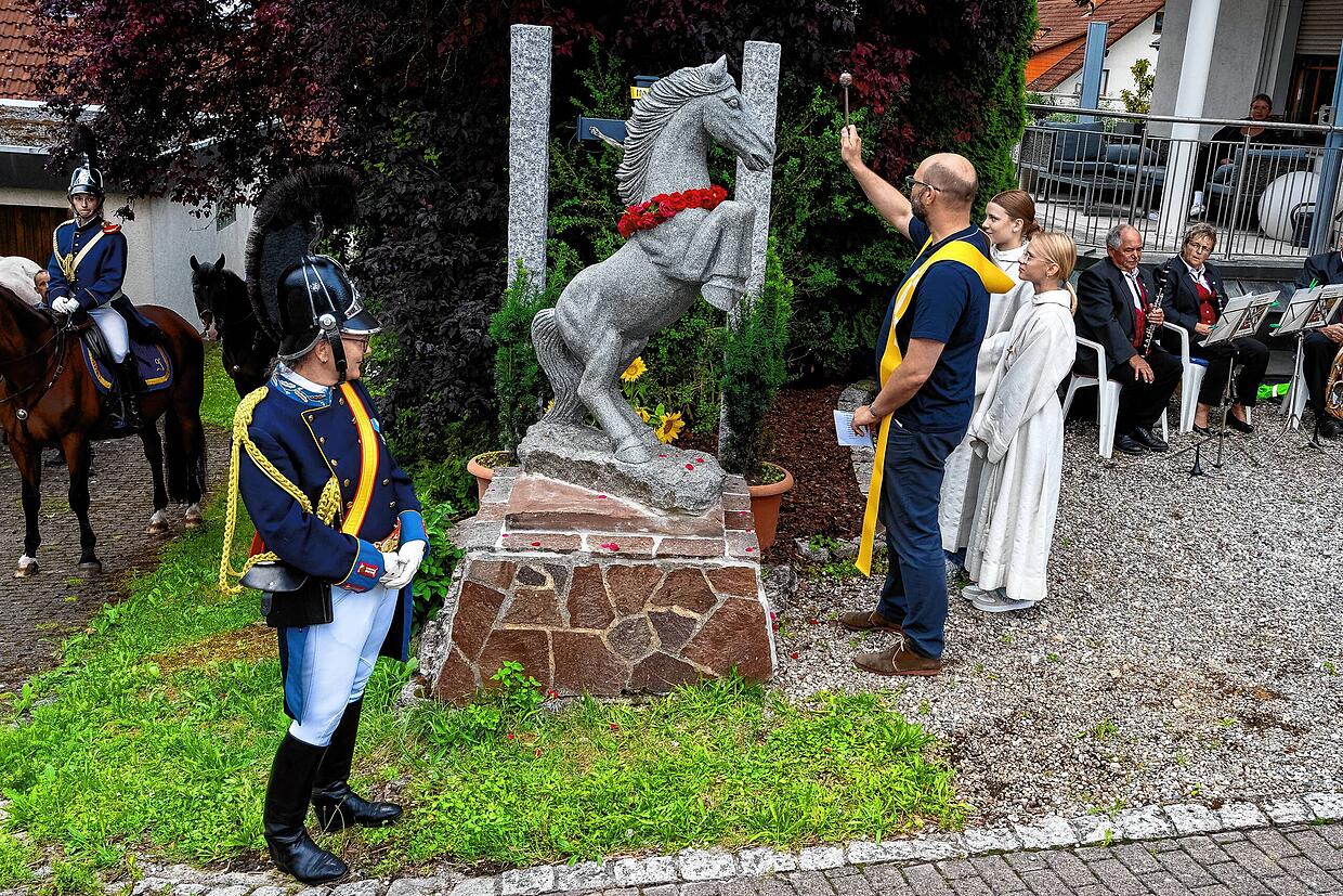 Brigachtal In der Marbacher Straße im Brigachtaler Ortsteil Kirchdorf ist es kurzfristig zu einem kleinen Stau gekommen. Der Grund? Neun Pferde waren vor dem Wohnhaus von Bernhard Käfer unterwegs, um die Segnung seines neu gestalteten Wegkreuzes eindrucksvoll zu umrahmen. Einige der Gäste reisten in einer der drei zweispännigen Kutschen an, begleitet von vier Pferden der berittenen Kavallerie der Villinger Bürgerwehr. Rittmeisterin Martina Spendel ist mit Bernhard Käfer befreundet, der als passionierter Pferdeliebhaber seinerseits eine der drei Kutschen fuhr. So hat er bei der Neugestaltung des Kreuzes vor seinem Haus passenderweise auch eine neue Pferdestatue aus Stein aufgestellt.