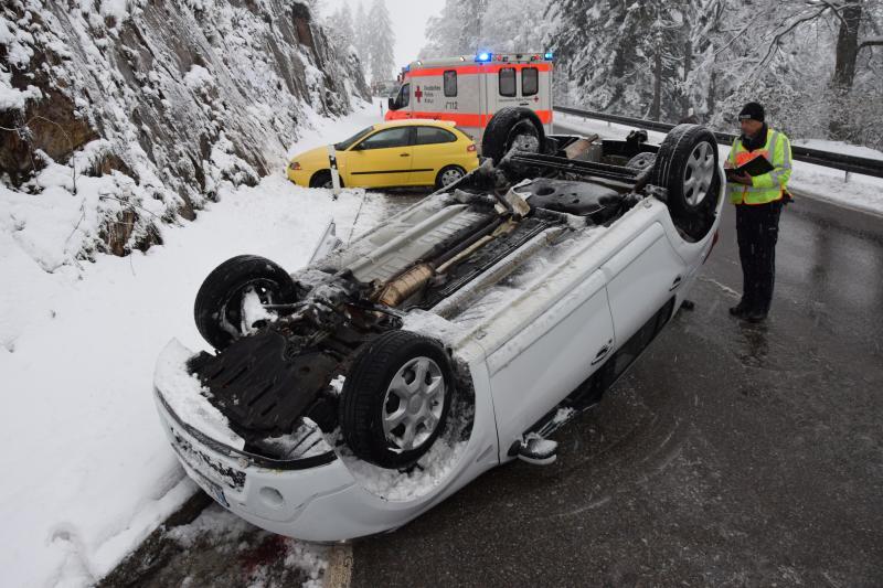 Am Freitragmorgen gegen 7 Uhr war eine Frau mit ihrem Dacia auf der Bundesstraße 317 in Fahrtrichtung Bärental unterwegs, als sie auf glatter Fahrbahn in einer Rechtskurve ins Schleudern geriet und mit ihrem Auto auf die gegenüberliegende Leitplanke prallte. Ihr Wagen wurde von der Leitplanke abgewiesen und schleudert weiter den Berg hinab. Dabei überschlug sich das Auto und blieb auf dem Dach liegen. Die leichtverletzte Frau konnte sich aus dem Wagen befreien.