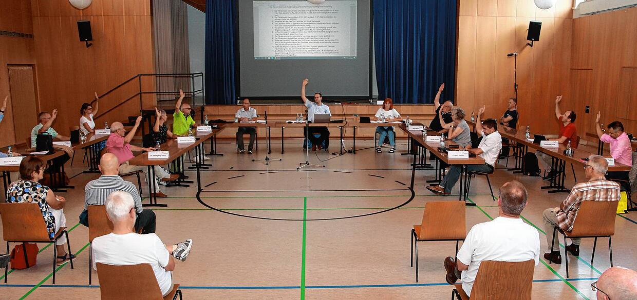 Die Zahl der am Donnerstagabend, nach dem vorherigen Bekanntwerden des Kompromissvorschlages zur Sitzung des Gemeinderates, in die Schlossberghalle gekommenen Besucher war hoch, aber nicht so hoch, wie zunächst angenommen. Blieben doch um 18 Uhr mit dem vorgesehenen Sitzungsbeginn einige der rund 70 Plätze in der Halle leer, während vor der Halle noch etliche Interessierte standen, die im Rahmen des Anmeldeverfahrens keinen Platz mehr bekommen hatten. Kurzerhand bot Bürgermeister Andreas Braun die freien Plätze den Leuten vor der Halle an, so dass schließlich bis auf gut 20 Zuhörer alle die Sitzung persönlich verfolgen konnten. Doch auch vor der Halle waren die Interessierten nicht ganz abgeschnitten. Der Förderverein machte eine Live-Übertragung des Tons aus der Halle möglich.